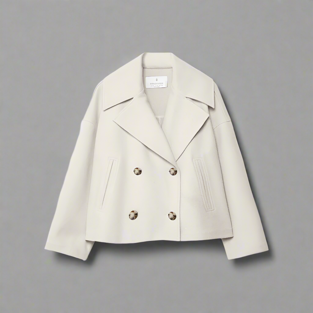 Deze korte damesjas met double-breasted sluiting combineert klassieke elegantie met een moderne uitstraling. Het tijdloze ontwerp in cropped lengte is ideaal voor frisse dagen en geeft elke outfit een chique en stijlvolle finishing touch.